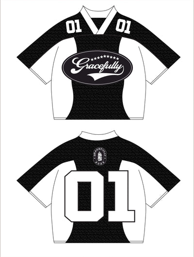 This oversized jersey fuses sport energy with intentional design — a bold declaration of poise under pressure. The all-over G monogram texture and contrast panelling elevate the silhouette, while the varsity-style 01 hits and signature Gracefully logo bring athletic confidence to a thoughtful message.